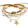 Set x 3 Tobilleras ajustables con nudo corredizo, para utilizar individuales o en conjunto. Elaboradas en conchitas naturales, macramé y cadena en oro golfy.